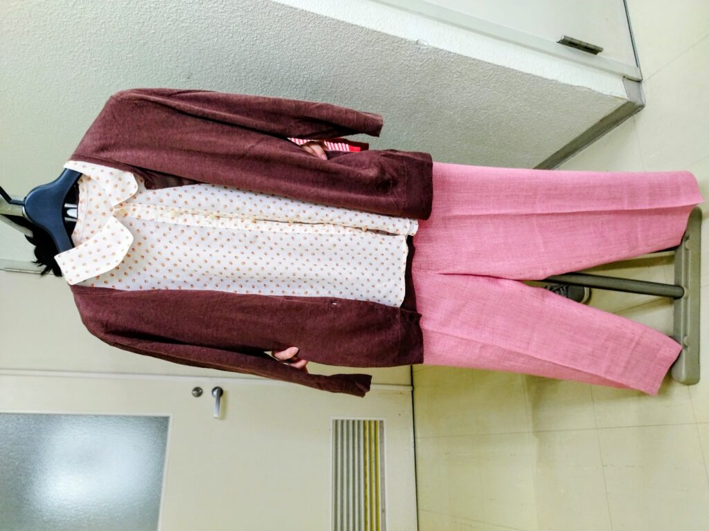 トップスのインナーは、オフホワイト地色にベージュ×ピンクのドット柄の襟付きブラウス